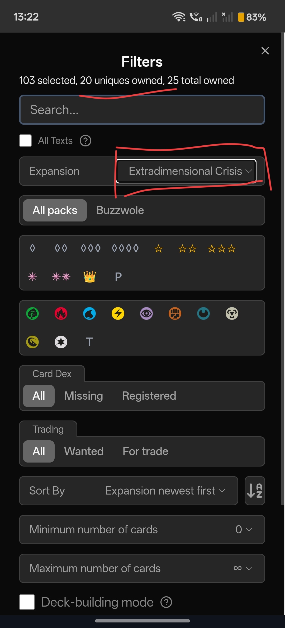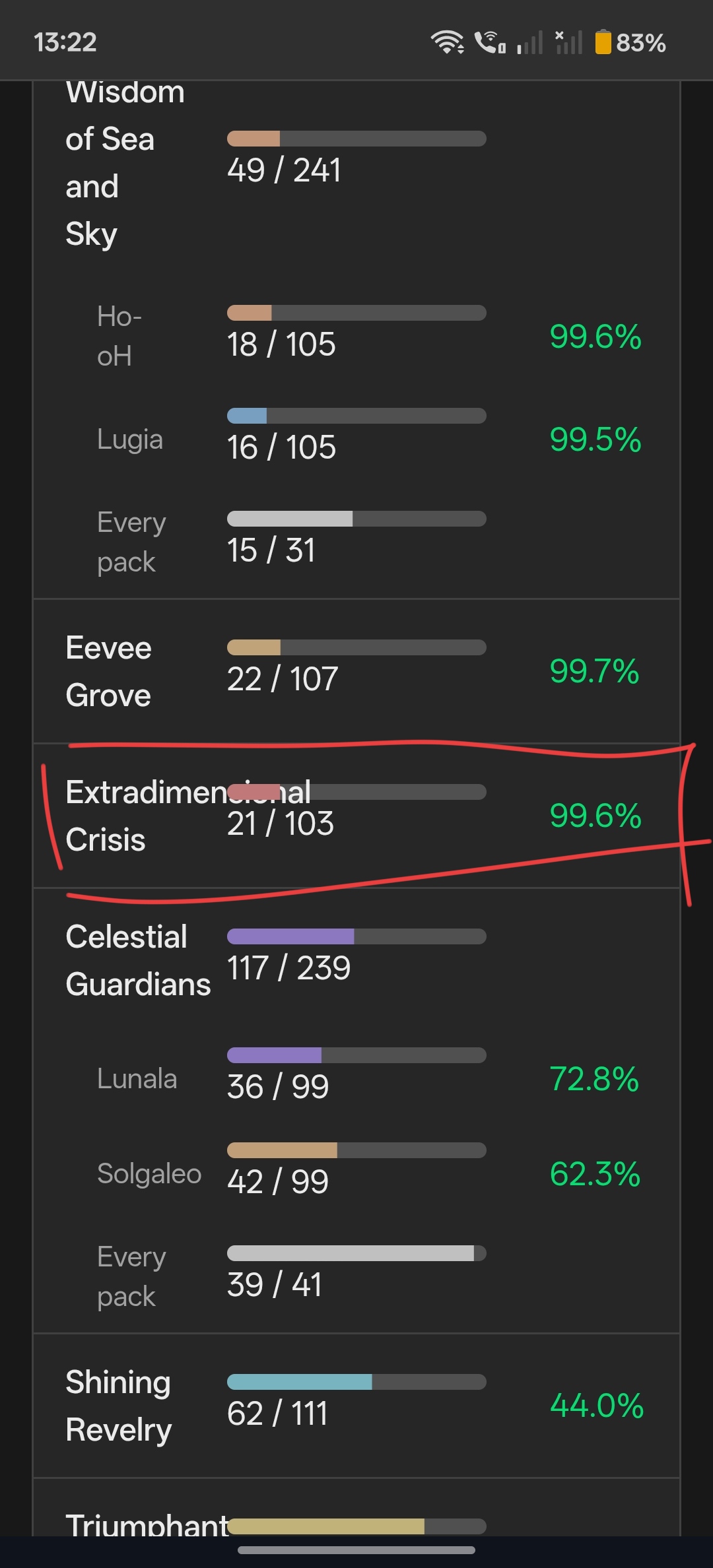 Just filtered the collection for ‘Extradimensional crisis’ expansion pack. Rest all are defaults. At the top it shows the unique and the total counts of the pack. In collection page, it shows 20 which is same as what I have in PTCGP app but in the Overview page is showing 21 unique cards which is not correct.