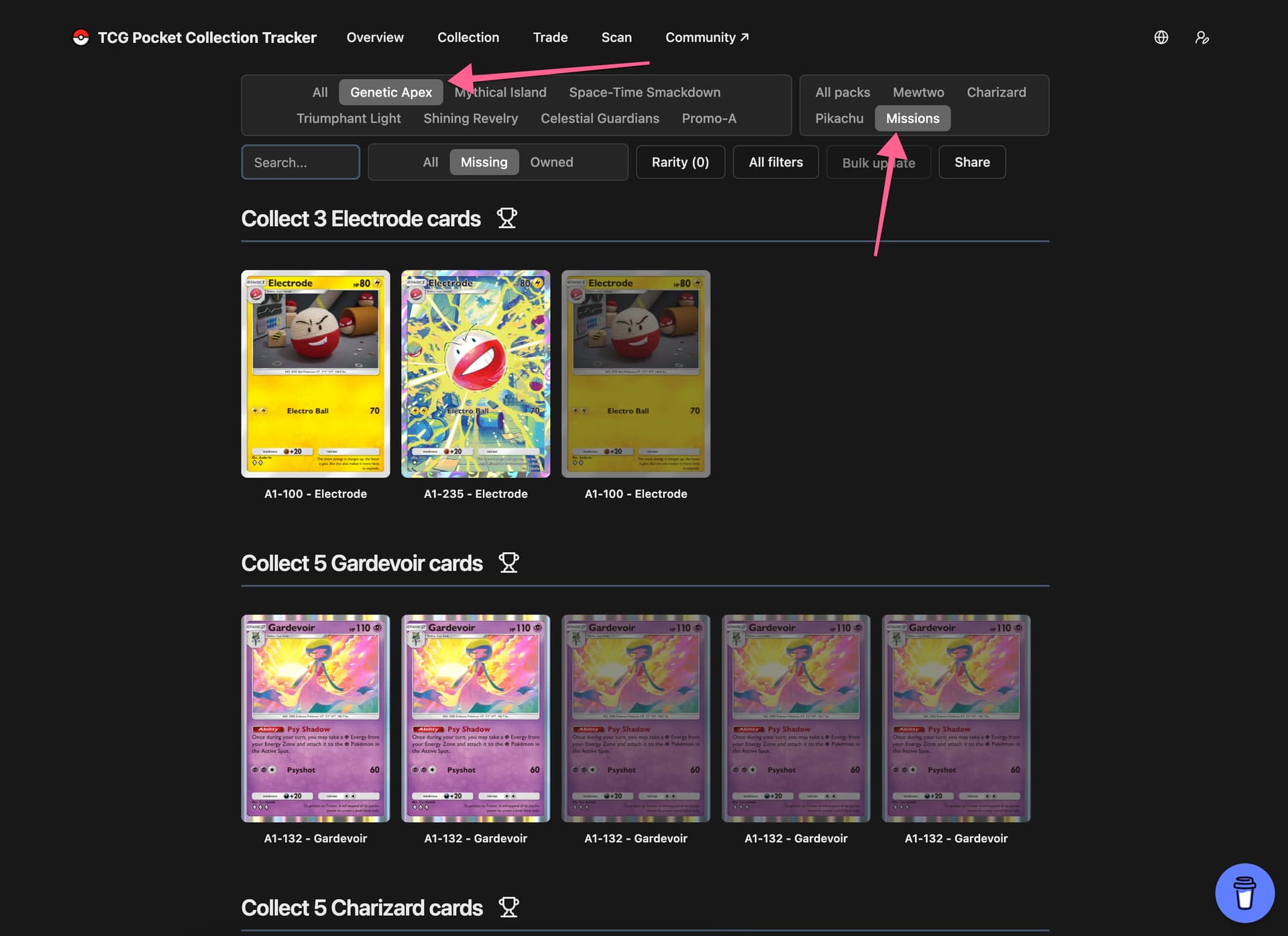 If you’re on the Collections page and click on a specific booster pack, you have the option to view a missions tab. This lists both the public and secret missions/themed collections for each pack and its requirements. Hovering over the trophy next to the mission shows you the prize.