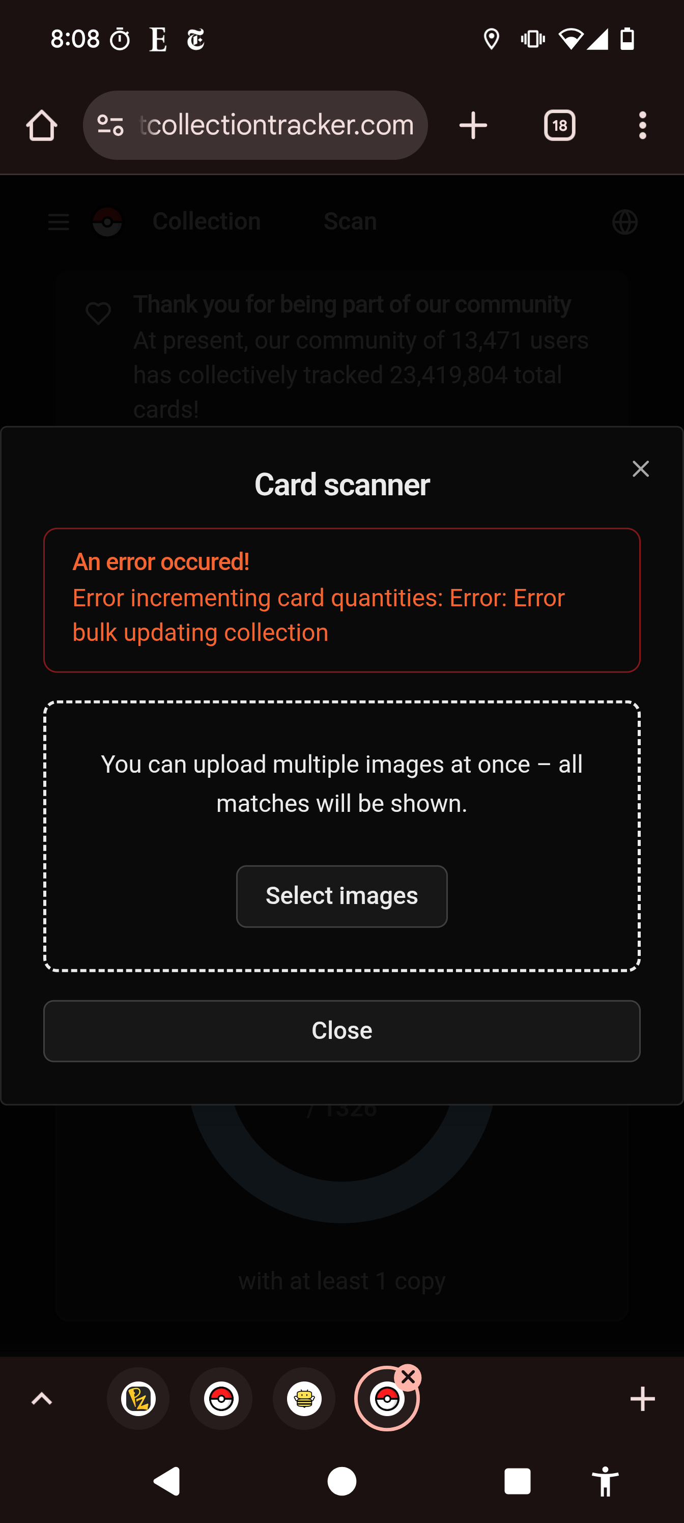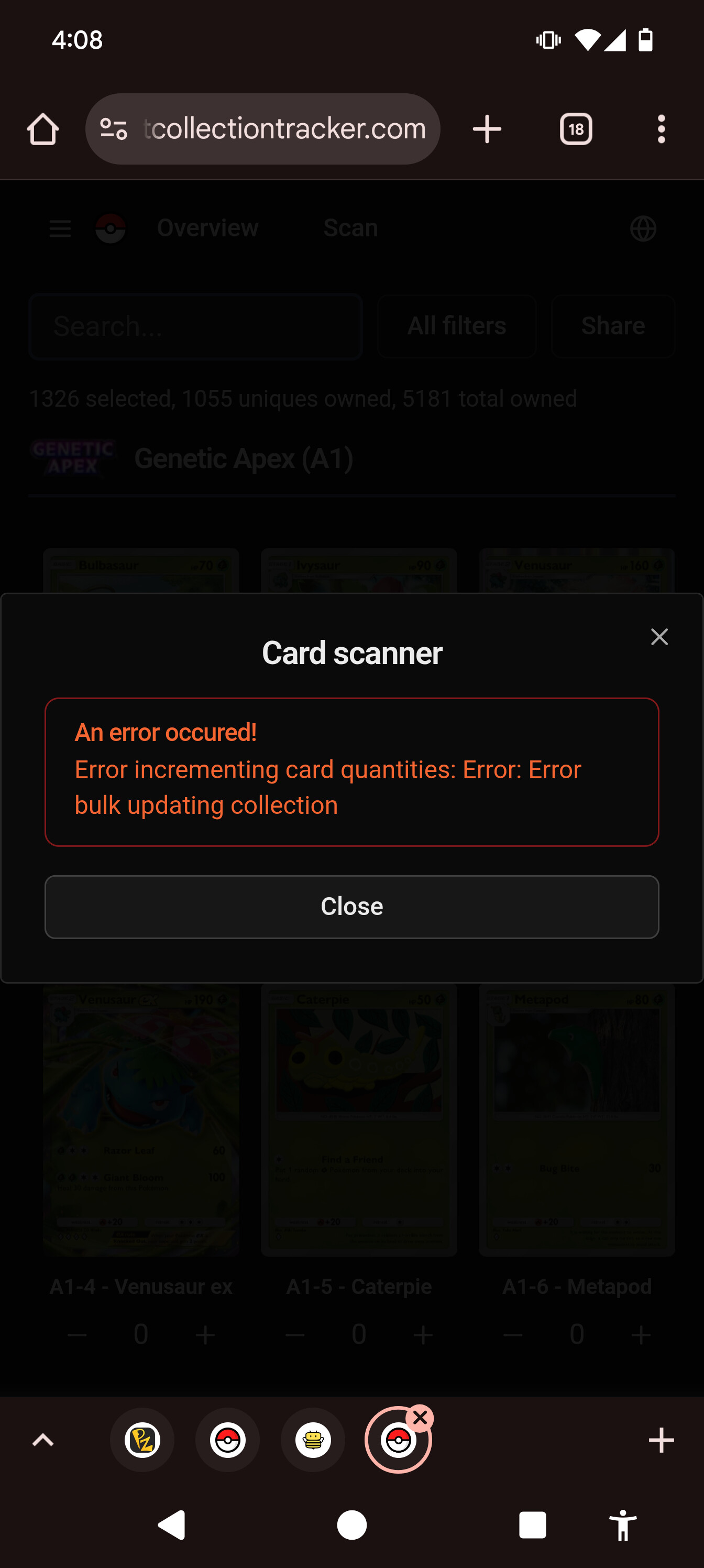 Ya same for me for about 4 or 5 days I think - scan takes a long time to initialize and then I get the error after hitting the ‘update selected cards’ button.