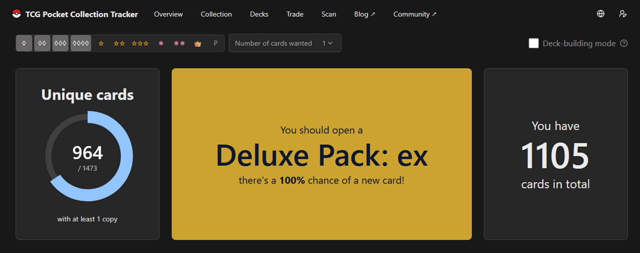 Basically with the new Deluxe EX update, I have no interest in opening packs. But this means that on the Overview page, it will forever show that, “You should open a Deluxe Pack: ex”. I would love for a way to mark the Deluxe EX set as skipped or “not collecting” or something so that the Overview page would display the set with the highest % from a set I’m actually interested in. Otherwise, I’ll have to always scroll down on the overview and scan for the highest % that isn’t Deluxe Pack.